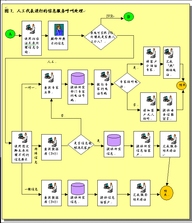 在上文提到的各種呼叫處理辦法都需要與提供服務的公司部門緊密配合和協(xié)作。這些部門將負責及時準確地為呼叫中心服務提供信息,滿足經過呼叫中心或網絡初期處理的服務請求。