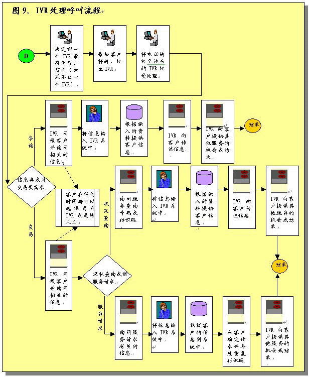 根據呼叫處理部分所作的說明,在完成初次聯(lián)絡過程之后,服務代表將確定呼叫者的需要。之后服務代表將協(xié)助呼叫者或者使其選擇IVR系統(tǒng),該系統(tǒng)通過自動為這些請求錄音提供相關的信息和服務。服務代表將接受培訓識別哪些交易服務和信息服務可以通過IVR進行,這樣他們可以使呼叫者選擇自我服務。圖9圖示了用這一辦法處理呼叫的過程。
