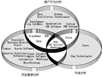這一市場的供應商目前主要分為兩大陣營:一類著眼于客戶行為傾向分析;另一類著眼于對客戶價值進行評估。前者主要注重了解客戶的喜好,而后者則著重關注客戶對企業(yè)的潛在收益。