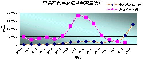 第三階段:1999年以后的快速增長階段。1999年中高檔汽車產(chǎn)銷量結束了六年的徘徊局面,首次突破5萬輛,比上年增長了1.5倍,在轎車市場中的占有率升到9.7%。2000年中高檔汽車的產(chǎn)量又實現(xiàn)翻倍,增長率為232.46%,年產(chǎn)量達到127,676臺。進口中高檔汽車數(shù)量也超過了3萬臺,僅日本車的進口量就達23,502臺。