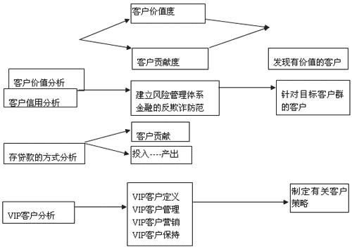 下面是一個以銀行業(yè)為例CRM中BI分析的一個簡單的應用方式。