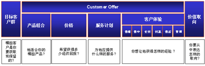 Customer Offer, 以細分的目標客戶價值取向為導向, 其包含符合目標客戶群需求的產(chǎn)品或服務, 符合企業(yè)對該目標客戶價值回報的定價, 以及符合目標客戶群行為習慣的客戶體驗. 往往由專門的CRM功能部門(可為虛擬部門)來負責設計, 協(xié)同戰(zhàn)略, 市場, 研發(fā), 銷售和服務等部門共同完成. 其模型如下: