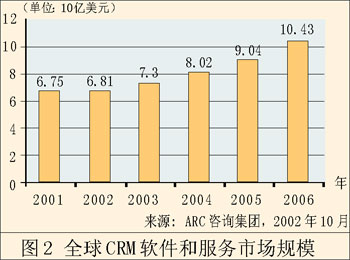 單單這還不是惟一能夠說明問題的。早在2002年,F(xiàn)orrester研究公司就聲稱,來自CRM的收入將從428億美元增長(zhǎng)到738億美元。AMR研究公司同樣預(yù)測(cè),這個(gè)領(lǐng)域會(huì)不斷增長(zhǎng)。AMR的調(diào)查表明,91%的公司會(huì)在這方面增加開支,預(yù)計(jì)總開支會(huì)增長(zhǎng)8%。值得一提的是,AMR所指的這一塊市場(chǎng)是“客戶管理”,而不是較為傳統(tǒng)的CRM,這說明CRM應(yīng)用軟件的作用發(fā)生了轉(zhuǎn)變。