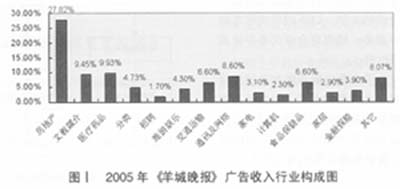 廣告客戶(hù)在報(bào)紙投放廣告的目的在于說(shuō)服讀者成為其產(chǎn)品或服務(wù)的消費(fèi)者,他們最感興趣的是向那些最有可能成為其消費(fèi)者的讀者做廣告,而“報(bào)紙讀者與廣告目標(biāo)受眾的相關(guān)性決定了廣告信息是否能夠到達(dá)廣告客戶(hù)所希望的人群”。為此,廣告客戶(hù)更愿意在其目標(biāo)消費(fèi)群接觸率高的報(bào)紙上投放廣告。由于《羊城晚報(bào)》的讀者群具有學(xué)歷較高、職業(yè)較穩(wěn)定、收入較高、消費(fèi)能力較強(qiáng)等特點(diǎn),因此成為房地產(chǎn)、汽車(chē)、電訊、家具等耐用消費(fèi)品行業(yè)塑造品牌的平臺(tái)。另外,《羊城晚報(bào)》的讀者以家庭訂戶(hù)為主,他們對(duì)健康、教育、休閑、娛樂(lè)比較關(guān)注,因此醫(yī)藥、文化教育、食品保健品、旅游等廣告在羊城晚報(bào)也占有較大比例(見(jiàn)圖Ⅰ,統(tǒng)計(jì)期間為2005年1月-10月)。