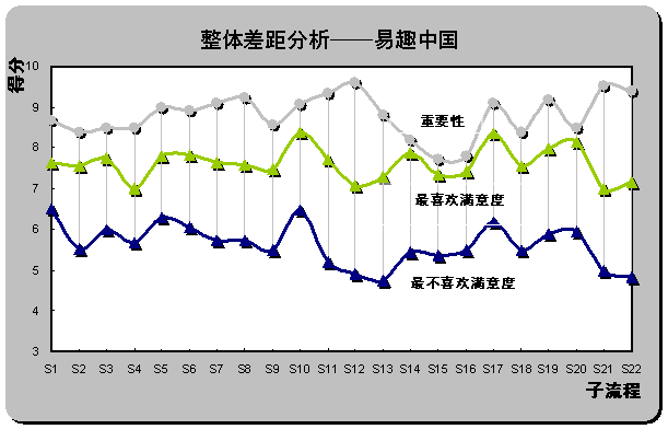 2) 重要流程欠缺最優(yōu)體驗(yàn)。雖然易趣中國被認(rèn)為是最不喜歡的在線銷售網(wǎng)站,但從滿意度評分也同時(shí)可以發(fā)現(xiàn),易趣中國在S1(瀏覽速度),S16(個(gè)人定制促銷信息的發(fā)布)和S15(個(gè)性化頁面設(shè)置)還是為用戶設(shè)計(jì)了相對較好的體驗(yàn)。但重要性得分排名前三位的子流程中,S12(產(chǎn)品質(zhì)量可靠)、S21(退換貨服務(wù))和S22(客戶投訴和反饋)仍為重要性與滿意度差距最大的三個(gè)子流程,易趣中國也未在重要流程上為用戶設(shè)計(jì)優(yōu)越的在線體驗(yàn)。