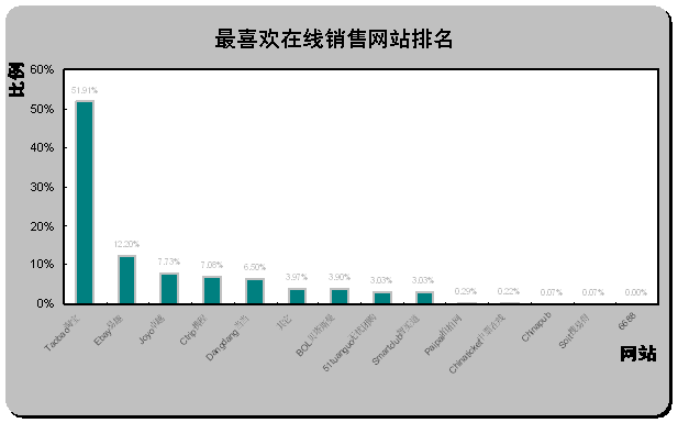 China和貝塔斯曼BOL成為“最不喜歡在線銷售網(wǎng)站”的前兩名,分別有19.77%和18.40%被調(diào)查者選擇易趣和貝塔斯曼作為“最不喜歡在線銷售網(wǎng)站”,兩家網(wǎng)站以相對較大的比例領(lǐng)先與其他各在線銷售網(wǎng)站。雖然淘寶以巨大的優(yōu)勢成為“最受歡迎的在線銷售網(wǎng)站”,但同時(shí)也可以發(fā)現(xiàn),仍有8.08%的被調(diào)查者選擇淘寶作為“最不喜歡在線銷售網(wǎng)站”,其它“最不喜歡在線銷售網(wǎng)站”比例相對較大的還有為當(dāng)當(dāng)(7.79%)。
