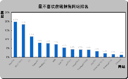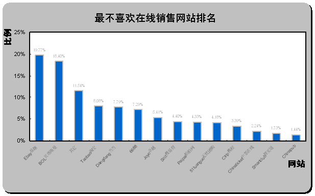 易趣中國和貝塔斯曼最不受歡迎。從最不喜歡在線銷售網(wǎng)站排名(如上圖)可以看出,易趣中國eBay
