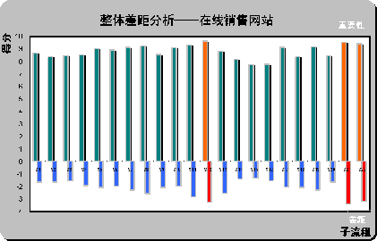 (2)整體差距分析(Gap Analysis)。請見上圖X軸下方所示,計(jì)算所有被調(diào)查對所列在線銷售網(wǎng)站的滿意度平均值(綜合最喜歡在線銷售網(wǎng)站和最不喜歡在線銷售網(wǎng)站的滿意度,計(jì)算被調(diào)查者對22個(gè)子流程的滿意度評分)。通過計(jì)算重要性和滿意度的差距,首先,一個(gè)有趣的現(xiàn)象,在著色的三個(gè)差距最大的子流程剛好也是重要性得分排名前三位的流程S12,