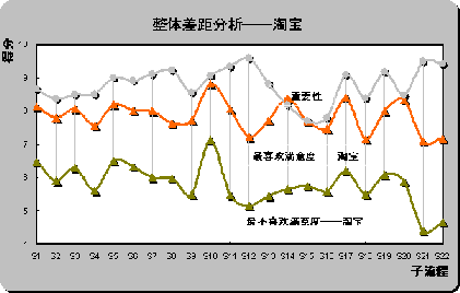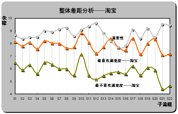 S12(產(chǎn)品質(zhì)量可靠)和S22(客戶投訴和反饋),具體差距分別為2.44,2.38和2.22。也是重要性評分排名前三位的子流程。雖然淘寶成為用戶最喜歡的在線銷售網(wǎng)站,但在重要子流程上并未為用戶設(shè)計(jì)最佳體驗(yàn)。
