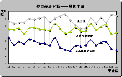 從前面分析可知,易趣以19.77%的比例成為最不喜歡在線銷售網(wǎng)站,選擇被調(diào)查者對子流程評分——最喜歡、最不喜歡在線銷售網(wǎng)站滿意度曲線與重要性曲線進(jìn)行差距分析。