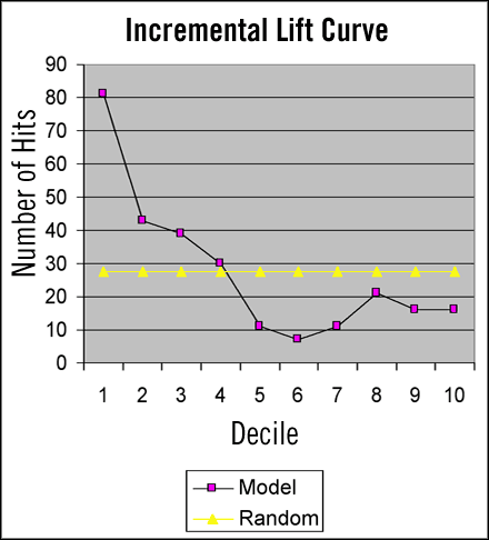 在增量提升曲線中標示了各個分段的命中數(shù)。 在圖1中可以看到,增量提升曲線在第4個分段后和隨機期望線(275個響應的10%,即平均每個分段27.5個響應)交叉。