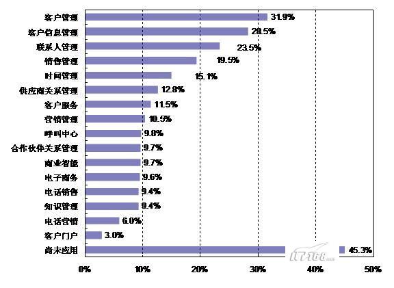 。。調(diào)查顯示,2007年有45.3%的企業(yè)還未應(yīng)用CRM信息化系統(tǒng)。在已經(jīng)應(yīng)用該系統(tǒng)的企業(yè)中,CRM系統(tǒng)應(yīng)用主要就是客戶管理,占到31.9%;其次是客戶信息管理和聯(lián)系人管理,這些應(yīng)用比例集中在23~31%之間;其他應(yīng)用還有銷售管理(19.5%)、時(shí)間管理(15.1%)、供應(yīng)商關(guān)系管理(12.8%)、客戶服務(wù)(11.5%)和營銷管理(10.5%)等,呼叫中心、合作伙伴關(guān)系管理、商業(yè)智能、電子商務(wù)、電話銷售、知識(shí)管理、電話營銷等比例均在10%以下。