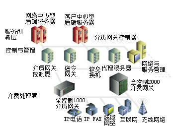 8200 IP傳真服務(wù)器等。中間層通過(guò)協(xié)議適配解決通用信令問(wèn)題,并且提供網(wǎng)絡(luò)和服務(wù)管理。第一層包含Total Control 1000介質(zhì)網(wǎng)關(guān),它通過(guò)多種訪問(wèn)網(wǎng)絡(luò)將不同類型的業(yè)務(wù)量綜合在一起。