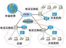 目前,大多數(shù)大型企業(yè)與分支機構的電話和計算機網(wǎng)絡是相互獨立的,分處各地的辦公機構建有局域網(wǎng),局域網(wǎng)之間通過Internet或企業(yè)專網(wǎng)互連,企業(yè)的數(shù)據(jù)業(yè)務通過計算機網(wǎng)絡傳輸。而各辦公機構的電話網(wǎng)則采用傳統(tǒng)的電話交換機或集團電話,內(nèi)部員工之間相互是分機撥號,電話交換機接入電信電話公網(wǎng),與外部的語音交流需要通過本地電話網(wǎng)或長途電話網(wǎng)。