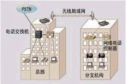 如圖2所示,兩個辦公樓之間距離較遠,不方便布線,其計算機網(wǎng)絡可以通過無線局域網(wǎng)來連接。在總部已有電話交換機系統(tǒng),這時只需在分支機構中增加Cisco網(wǎng)絡電話控制器,布署IP電話機,然后通過總部帶語音模塊的Cisco路由器或交換機,接入總部的電話交換機,分支機構就可以享用總部的電話中繼線路,與總部一樣自由地使用電話系統(tǒng)。