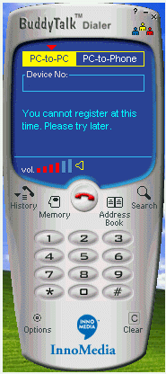 。ㄈ鐖D3),這個就是BuddyTalk的軟件界面。這象不象一個手機?上面的藍(lán)色部分是液晶屏。你可以選擇pc-to-pc或者pc-to-phone,下面是用來輸入電話號碼的一個空框,空框下面的部分是軟件顯示提示信息的,再下面是音量大小的顯示器。液晶屏的下面部分跟手機幾乎一樣,其中一個“search”,這是用來上網(wǎng)實現(xiàn)全球用戶數(shù)據(jù)庫搜索,一個“options”,各種設(shè)置可以在這里完成,“Memory”記錄的是你通話信息,以利快速撥號。
