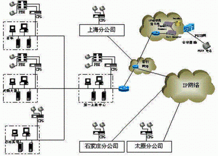 方案中VoIP的應(yīng)用是比較典型的,同時也有比較特殊的地方:溫州、石家莊等地區(qū)沒有被首創(chuàng)網(wǎng)絡(luò)覆蓋到,而客戶仍想采用IP電話方式,據(jù)此首創(chuàng)網(wǎng)絡(luò)提出了部分通過公網(wǎng)Internet傳輸數(shù)據(jù)的個性化方案以滿足客戶的需求。