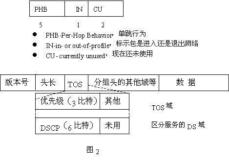 QoS的業(yè)務區(qū)分結(jié)構(gòu)使用IPV4報頭中的業(yè)務類型(TOS)字段,并將8位TOS字段重新命名,作為DS字段,其中6位可供目前使用,其余2位以備將來使用。該字段可以按照預先確定好的規(guī)則加以定義,使下行節(jié)點通過識別這個字段,獲取足夠的信息來處理到達輸入端口的數(shù)據(jù)包并將他們正確地轉(zhuǎn)發(fā)給下一跳的路由器。這里需要注意的是在IPV4網(wǎng)中所定義的TOS字段與在Diff-Serv中的DS字段不同。TOS字段的定義如圖2所示。圖IPV4報頭中TOS字段定義Diff-Serv充分考慮了IP網(wǎng)絡本身靈活,可擴展性強的特點,將復雜的服務質(zhì)量保證通過DS字段轉(zhuǎn)換為先進的單跳行為,從而大大減少了信令的工作。