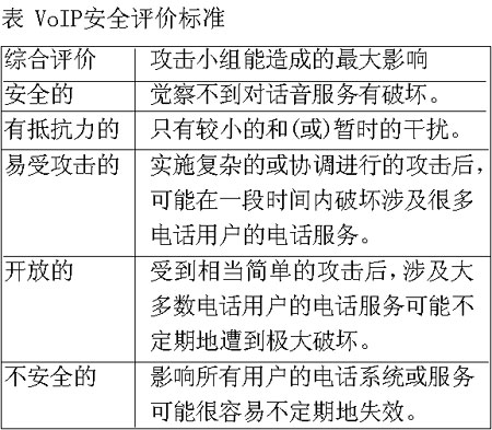測試結果表明,采用了復雜攻擊手段的攻擊小組無法破壞思科公司的VoIP網(wǎng)絡,甚至無法對其造成顯著的干擾。這套精心制造的IP電話系統(tǒng)(包括第二層和第三層基礎設施以及各式各樣的附加安全軟件)是“安全的”(參見表中所示的VoIP安全評價標準),它最大限度地全面發(fā)揮了思科公司的網(wǎng)絡安全專長,利用了思科公司擁有的每一種防御武器。