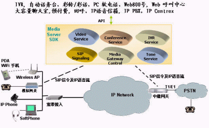 該公司的IP媒體服務(wù)器 (IP Media Server SDK)是一個具有IP多媒體處理能力和SIP呼叫功能的開放平臺。它主要提供給各增值業(yè)務(wù)開發(fā)商、軟交換廠商、軟件開發(fā)商以及具有開發(fā)能力的系統(tǒng)集成商;谠撈脚_,這些廠商可以迅速地、低成本地開發(fā)出各種各樣的基于IP的增值業(yè)務(wù)如下圖所示: