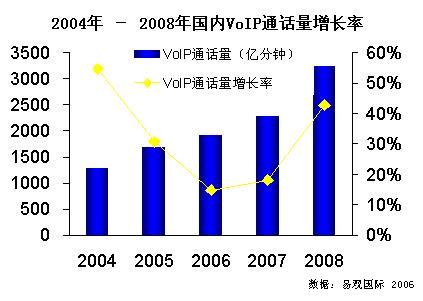 新華美消息:易觀國(guó)際《中國(guó) VOIP 市場(chǎng)監(jiān)管政策趨勢(shì)預(yù)測(cè)專題報(bào)告2006》中指出,VoIP 是大勢(shì)所趨,政策壓制的原因是開(kāi)放的條件不成熟。一切政策的制定都要遵從一個(gè)大前提,即保障公開(kāi)競(jìng)爭(zhēng)、維護(hù)國(guó)家和用戶利益、防止重復(fù)建設(shè)。2004年-2008年國(guó)內(nèi) VoIP 通話量增長(zhǎng)率圖下載: