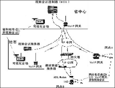 通過在全省部署VoIP系統(tǒng),網(wǎng)點(diǎn)VoIP網(wǎng)關(guān)可以通過H.245協(xié)議與視頻會(huì)議MCU(多點(diǎn)控制器)進(jìn)行通信能力的動(dòng)態(tài)協(xié)商,在國家、省和地市召開視頻會(huì)議時(shí),網(wǎng)點(diǎn)可以通過普通電話(或者電話會(huì)議終端)參與會(huì)議,實(shí)現(xiàn)“聽聲參會(huì)”,低成本地實(shí)現(xiàn)了行業(yè)視頻會(huì)議系統(tǒng)的延伸。