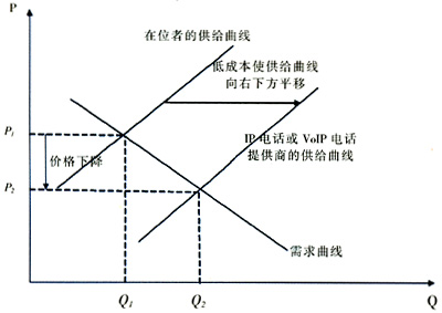 與傳統(tǒng)以電路交換為主的電話網(wǎng)相比,分組交換技術(shù)使得提供IP電話或VoIP電話所需的交換設(shè)備數(shù)量大大減少,而且部分提供IP電話或VoIP電話的運營商并沒有鋪設(shè)上下行用戶端的“最后一公里”線路。由于沒有全程布網(wǎng),在網(wǎng)間結(jié)算費較低甚至不結(jié)算的情況下,其運營成本自然遠低于本地運營商,從而使其供給曲線與本地運營商的供給曲線相比向右下方偏移,因而有能力推出價格遠低于傳統(tǒng)語音的IP電話或VoIP電話,見圖2。