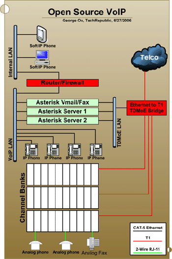 TDMoE(基于以太網(wǎng)的時(shí)分復(fù)用)LAN段負(fù)責(zé)PBX-語(yǔ)音郵箱和PBX-信道處理單元的通信。在過(guò)去,這些設(shè)備間的TDM通信使用昂貴的T1卡,但是通過(guò)將TDM通信搬到廉價(jià)的以太網(wǎng)上,這一點(diǎn)已經(jīng)得到極大的改善。