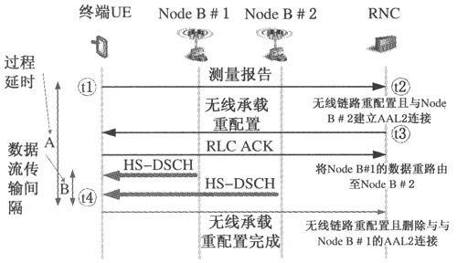 對(duì)于下面的延時(shí)分析,我們假設(shè)信令無(wú)線承載(SRB)在下行映射到HS-DSCH信道上,在上行映射到增強(qiáng)上行鏈路專(zhuān)用信道(E-DCH)上,且TTI均為10ms。HS-DSCH是HSDPA的傳輸信道,E-DCH是HSUPA的傳輸信道。首先,當(dāng)滿足測(cè)量觸發(fā)事件1d(最優(yōu)小區(qū)改變)時(shí),UE在信令無(wú)線承載上發(fā)送測(cè)量報(bào)告。傳輸從t1開(kāi)始,RNC在t2時(shí)刻接收到消息。服務(wù)RNC將為目標(biāo)NodeB保留基站資源和Iub資源。該資源的預(yù)留通過(guò)使用預(yù)配置可以完成得非?。一旦資源在t3時(shí)刻準(zhǔn)備好,RNC將向UE發(fā)送無(wú)線承載重配置消息,此時(shí)UE還是從源NodeB中接收數(shù)據(jù)。當(dāng)UE對(duì)重配置消息進(jìn)行解碼,并且在有效時(shí)刻t4到期前,UE接收數(shù)據(jù)將從源小區(qū)切換到目標(biāo)小區(qū)。UE開(kāi)始監(jiān)聽(tīng)目標(biāo)小區(qū)的高速共享控制信道(HS-SCCH),HS-SCCH是HSDPA下行的共享控制信道。UE也會(huì)測(cè)量目標(biāo)小區(qū)的信道質(zhì)量,并發(fā)送目標(biāo)小區(qū)的CQI報(bào)告。源小區(qū)該用戶的MAC-hs在小區(qū)切換后將重置,并將緩存的協(xié)議數(shù)據(jù)單元(PDU)刪除。同時(shí)目標(biāo)小區(qū)MAC-hs中的流控單元開(kāi)始從服務(wù)RNC中請(qǐng)求PDU,這樣便可以通過(guò)HS-DSCH向用戶發(fā)送數(shù)據(jù)。在小區(qū)切換過(guò)程中,RNC可以同時(shí)向兩個(gè)Node