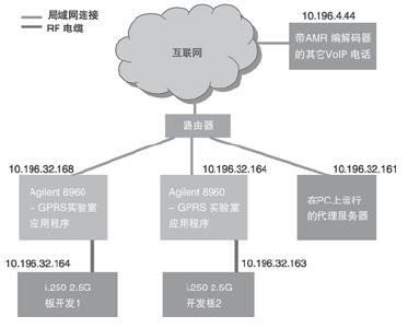 8960 ,將GRPS實驗室應用測試集用作媒介,將 i.250 2.5G 開發(fā)板卡 (ADS板卡)連接到互聯(lián)網(wǎng)。ADS板卡在接通電源時,注冊登錄到GPRS網(wǎng)絡,測試集然后通過路由器連接到互聯(lián)網(wǎng)。測試集充當連接到GPRS的DUT的橋梁,讓它們接入互聯(lián)網(wǎng)。一旦GPRS上下文激活,測試集將為ADS分配一個固定IP地址。此外,在PC上運行的代理服務器也連接到同一個路由器。通過這種安排,確保三個實體都能在同一網(wǎng)段內(nèi)運行。這樣就能對同一個網(wǎng)段內(nèi)的分組流量進行監(jiān)控,用于開發(fā)目的。