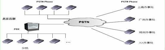 語音網(wǎng)絡(luò):總部部署有小型PBX,同時(shí)擁有部分直線PSTN電話,辦事處直接使用直線PSTN電話。