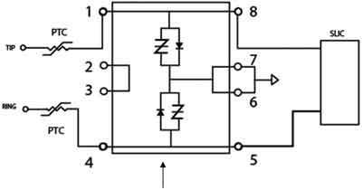 FXS要求SLIC保護(hù)器能夠?qū)⒍嘤嗟睦擞哭D(zhuǎn)移到SLIC T/R線路中。這是利用P1101DF-1的單向特性完成的。線路中出現(xiàn)的正浪涌將被反并聯(lián)二極管轉(zhuǎn)移到SIDACtor