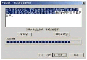 一般情況下,我們最好在語音識別功能安裝結(jié)束后立即按照系統(tǒng)提示單擊"下一步"對語音識別功能進(jìn)行訓(xùn)練,整個訓(xùn)練過程包括調(diào)整麥克風(fēng)和訓(xùn)練Office進(jìn)行語音識別兩部分(如圖3所示)。