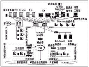 該方案采用Cisco的ICM中間件軟件作為系統(tǒng)的CTI服務(wù)器軟件平臺,并采用相關(guān)廠商的IVR和Dialer產(chǎn)品作為IVR服務(wù)器和外撥服務(wù)器軟件。地市客服中心采用了交換機(jī)的遠(yuǎn)端模塊設(shè)置遠(yuǎn)端座席。Cisco的ICM中間件不但具有大話務(wù)量處理的高性能,而且支持多點呼叫中心的設(shè)置和基于純IP技術(shù)的呼叫中心的擴(kuò)充,從而保證了系統(tǒng)的可擴(kuò)展性。系統(tǒng)結(jié)構(gòu)如圖1所示。