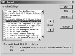 打開VBA編輯器,從工具選單中選擇引用命令,選定Microsoft Excel 10.0對(duì)象庫(kù)并確定(見圖2)。