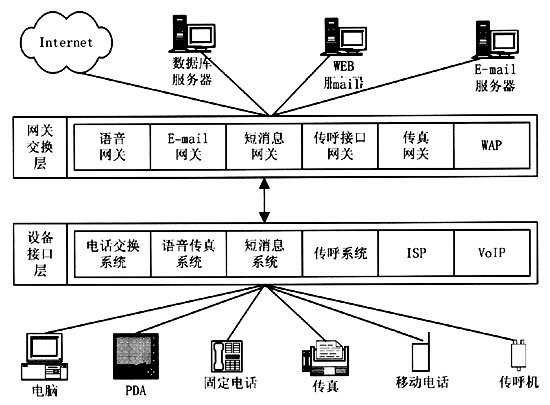 統(tǒng)一消息平臺集成了固定電話網(wǎng)、移動電話網(wǎng)和Internet網(wǎng)絡(luò)。目前,電話網(wǎng)和Internet網(wǎng)各自擁有獨立的網(wǎng)絡(luò)資源和信息服務(wù)領(lǐng)域,而這兩大網(wǎng)絡(luò)的用戶群存在著很大的交叉。電話的使用在中國已經(jīng)占有很高的普及率,傳統(tǒng)的160/168聲訊服務(wù)已經(jīng)成為中國百姓所熟悉的最具代表性的電話信息服務(wù),而Internet作為在中國剛剛興起的信息媒體,尚需要普通百姓逐漸認(rèn)識它、使用它。統(tǒng)一消息平臺將電話網(wǎng)和Internet網(wǎng)結(jié)合在一起,極大地擴(kuò)大了兩大網(wǎng)絡(luò)各自的用戶群,電話用戶可以用電話或者傳真獲取Internet上的信息,電子郵件服務(wù)也可以不局限于Internet,而能對廣大的電話用戶開放。統(tǒng)一消息平臺為用戶帶來的是信息的方便、及時,使人們在任何時間、任何地點都能夠獲取需要的信息。