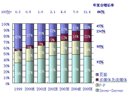 同時,人們對P-P的互動及多媒體的傳輸的需求將成為網絡使用的2個最主要的發(fā)展趨勢。據麥肯錫公司和JP摩根的分析和預測,多媒體及流媒體的IP流量將以每年154%的復合率增長,而P-P的IP流量將以95%的年復合增長率增長,這2項將成為用戶需求增長最快的業(yè)務。如下圖,