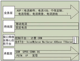 企業(yè)利用語(yǔ)音門(mén)戶,可以通過(guò)節(jié)省人工座席成本實(shí)現(xiàn)低成本地發(fā)布信息,提供客戶服務(wù),而且可以實(shí)現(xiàn)其它有價(jià)值的業(yè)務(wù),開(kāi)創(chuàng)新的市場(chǎng)空間和利潤(rùn),其業(yè)務(wù)系統(tǒng)層次如圖2所示。