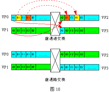 ATM中的兩種交換:虛通道交換(VCS:Virtual Channel Switching)和虛通路交換(VPS:Virtual Path Switching)。前者指同一個(gè)VP內(nèi)或不同VP內(nèi)的VC之間的交換;后者指一個(gè)VP內(nèi)所有信元同時(shí)被映射到另一個(gè)VP內(nèi)的過程。見下圖10。