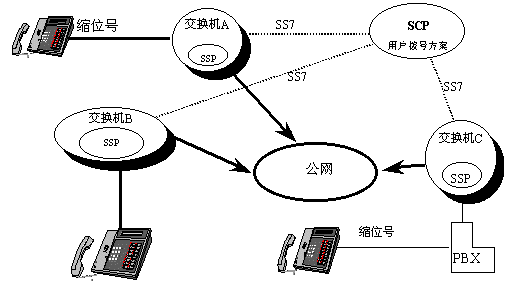 縮位撥號是指用一短的撥號(如三位)代替一長的撥號(如八位)的撥號方案。如下圖所示的智能網(wǎng)中,交換機A、B、C所有用戶的撥號方案數(shù)據(jù)都由SCP管理,當交換機收到用戶的縮位撥號后,通過SS7鏈路訪問SCP數(shù)據(jù)庫,返回對應的電話號碼,然后交換機通過公網(wǎng)把呼叫接通到該電話號碼,就和用戶直接撥打該電話號碼一樣。