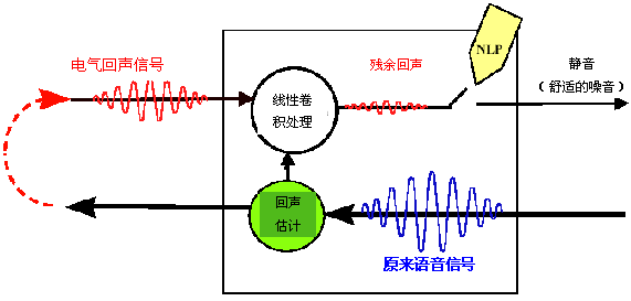 符合ITU G.168(2000)標(biāo)準(zhǔn)的回聲消除器能夠消除電氣(混合)回聲。這類設(shè)備在其運(yùn)行當(dāng)中采用了"兩段式"方法。在第1階段,使用線性卷積處理消除了大部分回聲。在第2階段,采用了非線性處理器(NLP)以消除殘存的回聲,這一部分相對較小。對殘存回聲信號的辨識是一件很簡單的任務(wù),這是因?yàn)樗墓β孰娖矫黠@低于原始的語音信號。