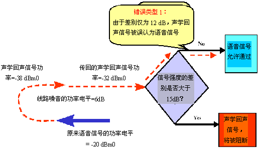 然而,如果判斷過程是根據(jù)功率電平的相對差異來進行的(而不是絕對差異),測量結(jié)果將更為準(zhǔn)確。通過在靜音期間測量兩個傳輸方向上的線路功率電平,就能得知相對的功率電平差異。使用在靜音期間獲得的信息,在分類信號前(即決定信號是聲學(xué)回聲還是有效語音),對呼叫兩端的功率電平差異進行修正,就能更加準(zhǔn)確地了解相對信號強度。該方法稱為智能語音檢測,它能顯著降?quot;錯誤類型1"出現(xiàn)的可能性,如圖9所示。注意,在分析該方法時,請比對圖5和圖9。