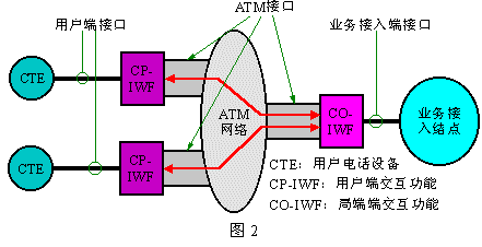 下圖2是VoATM的參考模型。其中的CTE為用戶電話終端設(shè)備,“業(yè)務(wù)接入結(jié)點”是指用戶電話業(yè)務(wù)的提供網(wǎng)絡(luò)在ATM網(wǎng)絡(luò)側(cè)的界;其中的CP-IWF完成用戶電路和ATM網(wǎng)絡(luò)的協(xié)作功能,而CO-IWF則完成ATM網(wǎng)絡(luò)和業(yè)務(wù)網(wǎng)絡(luò)的協(xié)作功能。