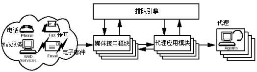 媒體交互模塊是跨媒體隊列結(jié)構(gòu)的通信入口。聯(lián)系中心所使用的每一種類型的媒體信道都與不同的模塊相關(guān)聯(lián),這些模塊檢測不同各自信道上的用戶請求,并將他們轉(zhuǎn)交給該隊列引擎。