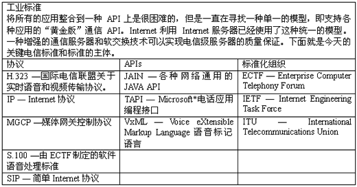新的標(biāo)準(zhǔn)像是Parlay,VoiceXML和WAP正在重新定義--和開始定義--業(yè)務(wù)提供商的環(huán)境。整個(gè)的網(wǎng)絡(luò)結(jié)構(gòu)正在進(jìn)化成一個(gè)基于標(biāo)準(zhǔn)模塊,協(xié)議,和編程接口的開放的體系。