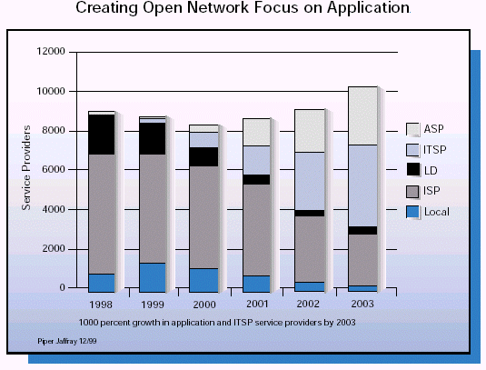 長(zhǎng)距離時(shí)間日漸商品化。業(yè)務(wù)提供商不斷地尋求更高價(jià)值的,與眾不同的業(yè)務(wù)來幫助他們提高消費(fèi)者的滿意度和吸引新的客戶。新一代的業(yè)務(wù)提供商會(huì)在帶寬上依賴于第三方的運(yùn)營(yíng)商,在Internet和語(yǔ)音服務(wù)器的基礎(chǔ)設(shè)施上依賴于托管業(yè)務(wù)提供商。而他們自己的精力將會(huì)主要放在建立一個(gè)本地接入上