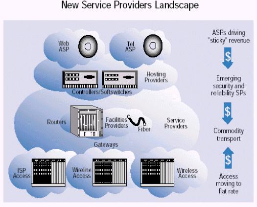 任何一個(gè)網(wǎng)絡(luò)的核心都是光纜和讓網(wǎng)絡(luò)工作起來的底層交換設(shè)備。傳統(tǒng)的業(yè)務(wù)提供商就是那些擁有這種底層設(shè)備的公司。但是打破傳統(tǒng)的語(yǔ)音環(huán)境為那些沒有這些底層設(shè)備的組織打開了向商業(yè)客戶和消費(fèi)者提供服務(wù)的大門。這種趨勢(shì)--網(wǎng)絡(luò)傳輸從電路交換轉(zhuǎn)變?yōu)榉纸M交換以及隨時(shí)可得的基于開放部件的劃算的業(yè)務(wù)平臺(tái)--使得這些新的業(yè)務(wù)提供商為自己的業(yè)務(wù)找到了商業(yè)機(jī)遇。