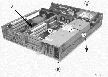 7. 抬起電源盒的基座,然后旋轉(zhuǎn)以便能將其放置到服務(wù)器單元外(這樣做不用斷開(kāi)纜線,但操作時(shí)要小心,以保證纜線不受擠壓);