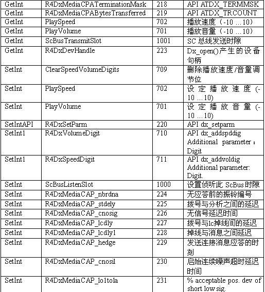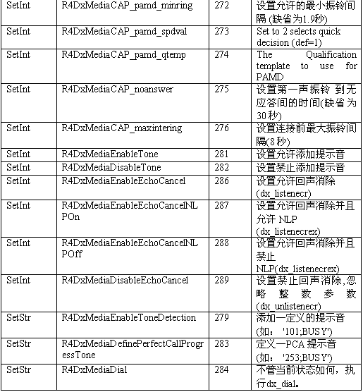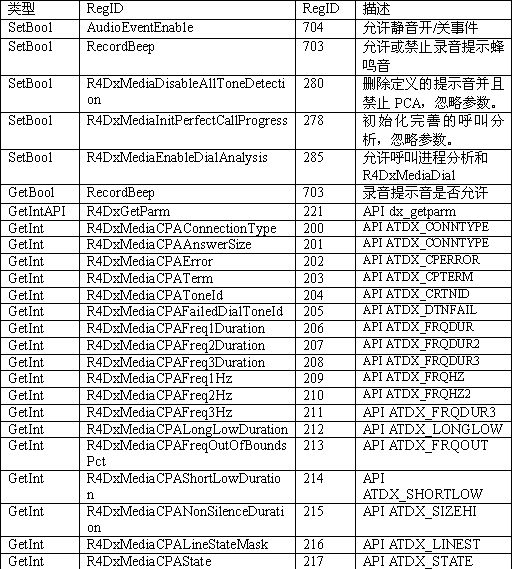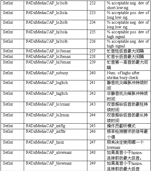 必須注意,調(diào)用API級(jí)的函數(shù)設(shè)置一個(gè)CTADE_A參數(shù)可能不只改變電路板級(jí)的參數(shù)。例如,R4DxMedia中,使用函數(shù)MediaSetBool設(shè)置REGID_R4DxMediaDisableAllToneDetection(280)為0或1來(lái)清除Dialogic提示音ID。