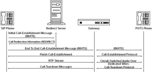 圖5里的重定向服務(wù)器,只處理發(fā)給被叫方的第一個(gè)INVITE消息,并反饋一個(gè)特殊的回應(yīng)給主叫方。主叫方從回應(yīng)中取出一個(gè)新的地址,并給這個(gè)地址發(fā)送INVITE消息。這個(gè)地址可能是真實(shí)的被叫方,代理服務(wù)器或者另一個(gè)重定向服務(wù)器。從這以后,所有消息都直接在主叫方和新的地址之間傳遞。